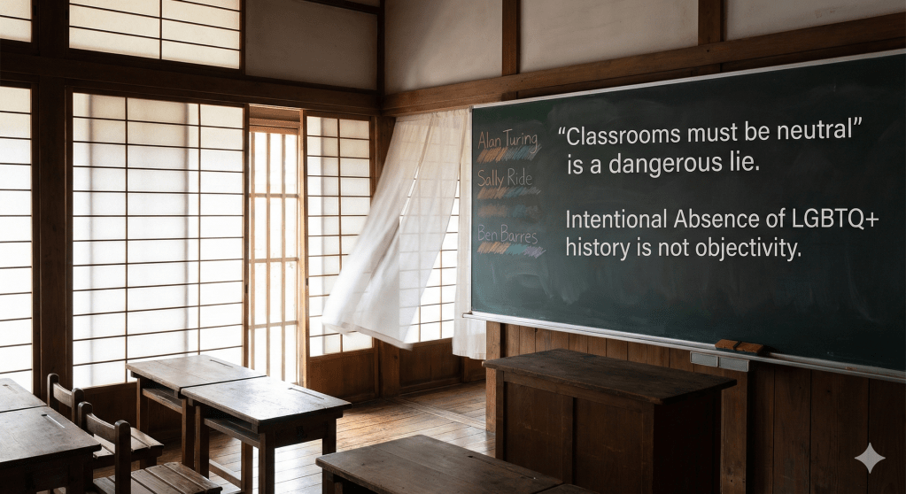 【English Version】 “Classrooms should be neutral”—this common claim is often a shield for maintaining the status quo. The lecture “Queering the Schoolhouse” argues that omitting LGBTQ+ history is “Intentional Absence,” not neutrality. In STEM, hiding the identities of scientists like Sally Ride, Ben Barres, and Alan Turing falsely suggests that only the majority contribute to progress. This silence drives marginalized students away. In history, excluding LGBTQ+ figures hands students an incomplete map of the world. California’s FAIR Act seeks to correct this by restoring erased history. The “Windows and Mirrors” theory explains that while majority students see themselves reflected (mirrors) in curricula, minority students only see others (windows), damaging their self-esteem and intellectual curiosity. Teachers can fight back against test-centric exclusion through “educational guerrilla warfare”—using posters, inclusive language, and supplementary materials. Teaching the whole truth is a matter of academic integrity.